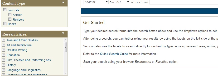 Research areas narrow down search results by subject area that Project MUSE specializes in (arts, letters and humanities rather than the pure sciences). Below are screenshots of most of the research areas.